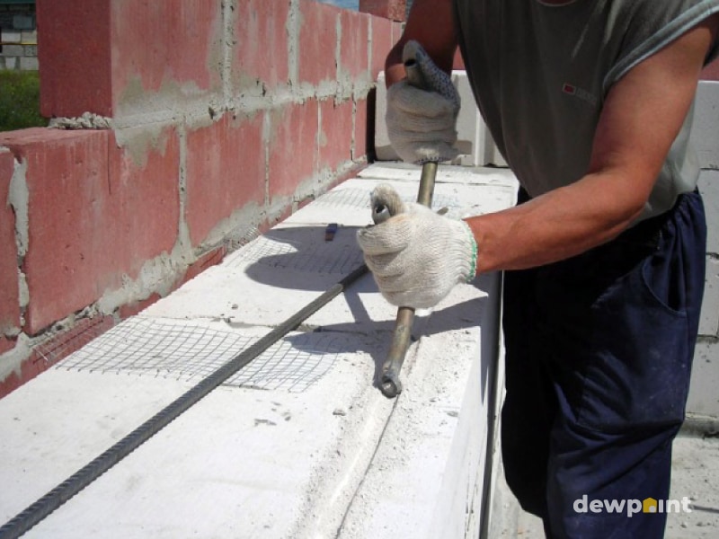 Для стандартных стен дома из газобетона делают 2 штробы, укладывают арматуру и заполняют разрезы клеем для газобетона. Для сцепления клея с блоками достаточно штробы диаметром 25 мм, при использовании другого раствора размеры штробы должны быть 40-50 мм. Расстояние от края блока должно быть 60 мм. Также по технологии необходимо, чтоб арматура не контактировала с камнем — для обеспечения защиты от коррозии металла.