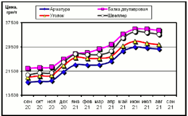Вырос на 65% сравнительно с аналогичным периодом 2020 года (данные metalika ua). Средняя цена за тонну арматуры в сентябре 2020 года была 17 404 грн, а в сентябре 2021 года — 28 811 грн. Пик цены на арматуру пришелся на июнь 2021 года, когда цена достигала 30 тыс грн/тонну. Такое значительное удорожание металла связано с увеличением объемов экспорта (в Китай). На данный момент (сентябрь 2021) цена на металл показывает небольшую тенденцию к снижению.