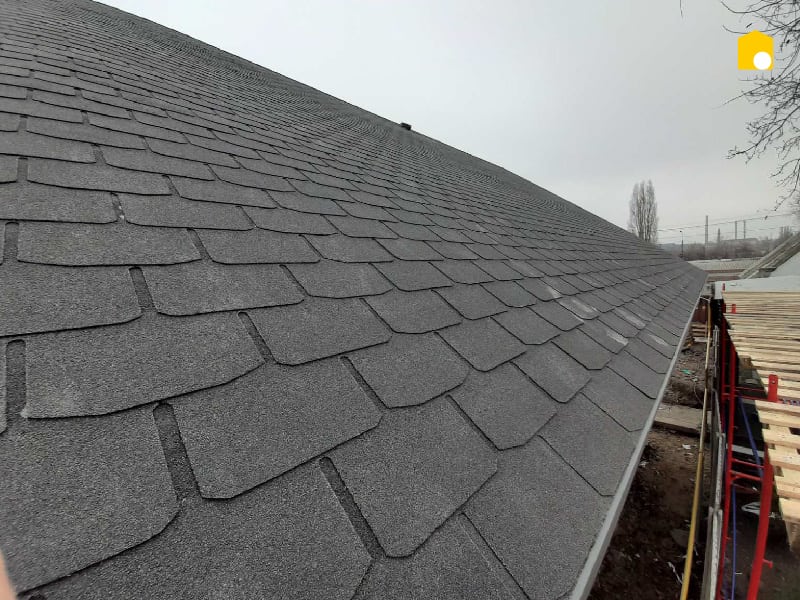 Для кроквяної системи був використаний якісний висушений брус вологістю 8-12%. Обране замовником покриття – бітумна черепиця німецького бренду Docke PIE – була змонтована згідно всіх норм (утеплення, гідро- і пароізоляція, OSB, підкладковий килим, потім безпосередньо черепиця).