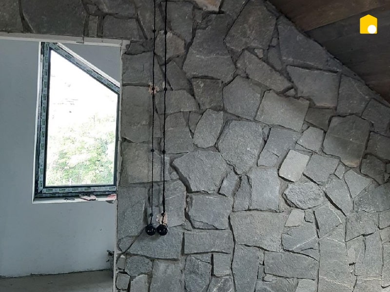 У цьому будинку змішалися стилі мінімалізму (біла штукатурка стін), лофт (елементи дерева, натурального каменю), а також ретро (розетки і вимикачі).