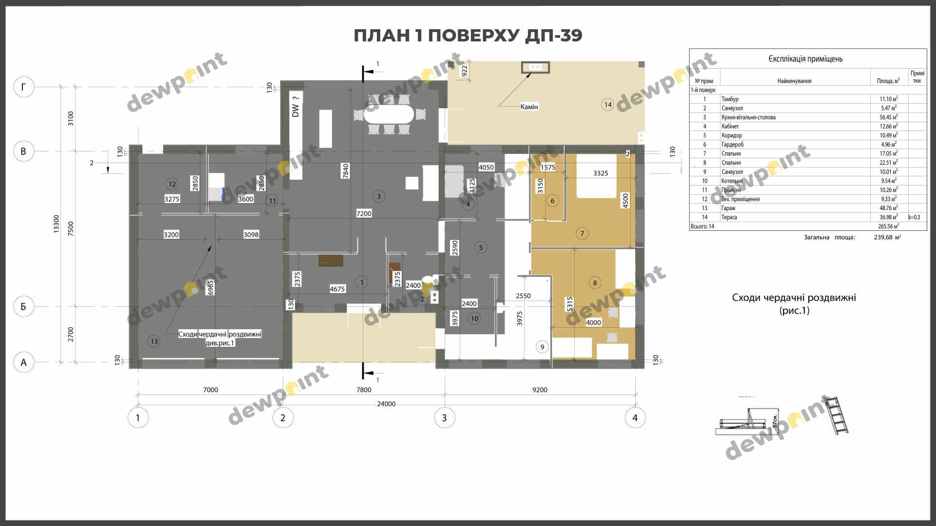 * У розрахунок не входять: тераси, навіси, балкони, димоходи, каміни, сходи на 2 поверх, міжкімнатні двері