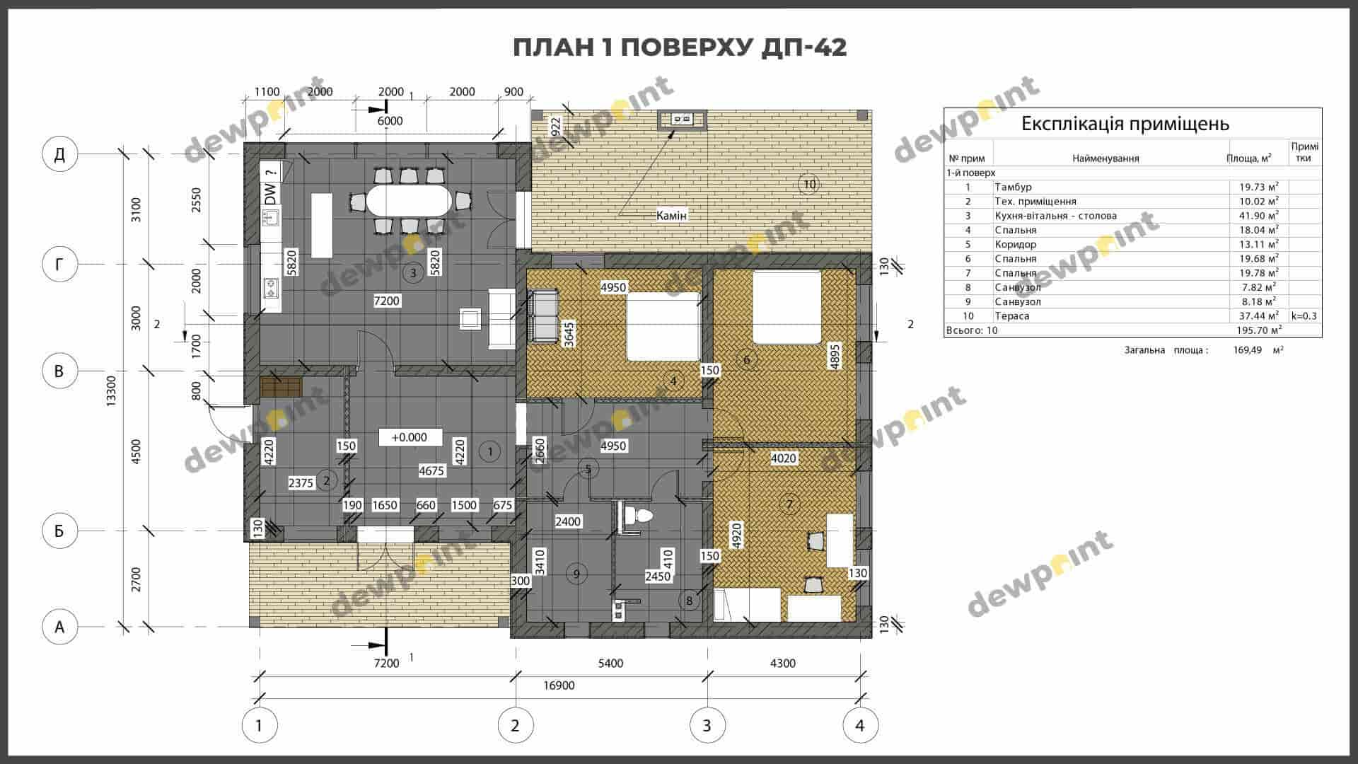 * У розрахунок не входять: тераси, навіси, балкони, димоходи, каміни, сходи на 2 поверх, міжкімнатні двері