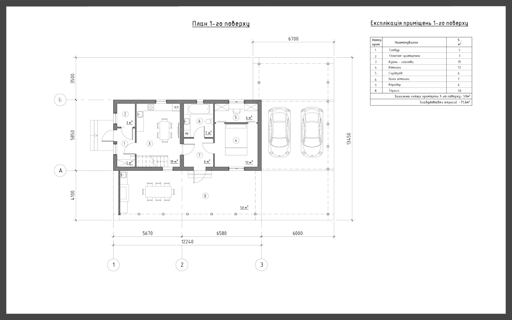 * У розрахунок не входять: тераси, навіси, балкони, димоходи, каміни, сходи на 2 поверх, міжкімнатні двері