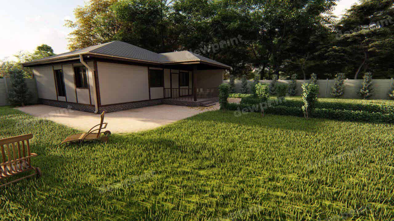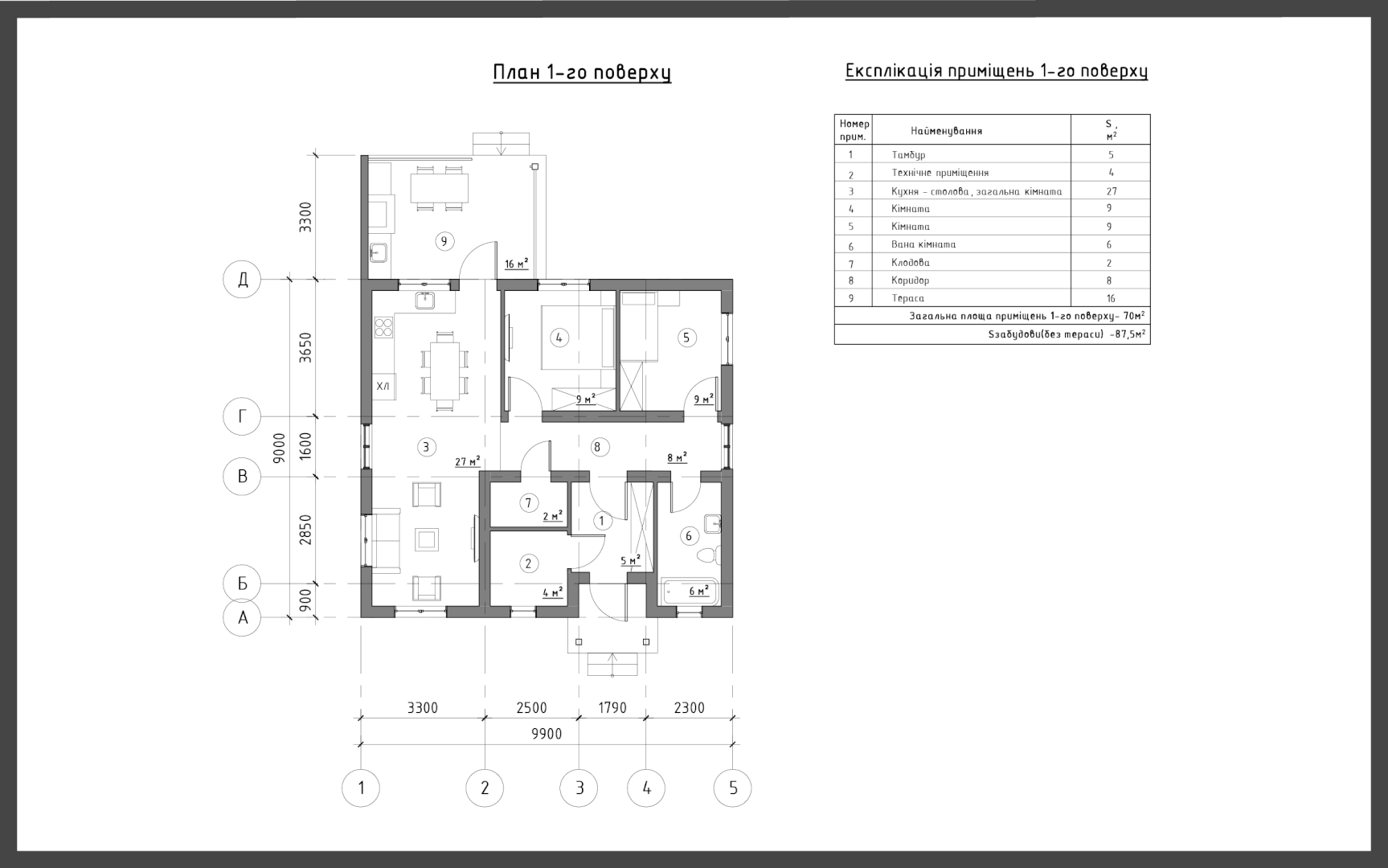 Цей охайний 1-поверховий будинок вміщує все необхідне для Вашої родини. Зовнішні габарити 9 на 9,9 метрів, площа забудови 87 кв.м. При вході в будинок — просторий передпокій. Далі з коридору — роздільний вхід в 2 ергономічно сплановані спальні. Санвузол — 6 кв.м. дозволить Вам розмістити всі необхідні прилади. Для прийому гостей зручно буде розміститися у вітальні, поєднаній з кухнею-їдальнею (загальна площа 27 кв. м.), з якої відкривається вид на терасу (16 кв.м.). Також в будинку є технічне приміщення, де можна розмістити насосну станцію, котел. +комора для господині будинку!