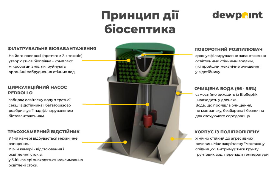Ще більш вдосконалений метод очищення каналізаційних стоків – септик глибокої біологічної очистки, так званий біосептик. Тут відбувається не тільки механічне очищення (відокремлення і утримання грубих часточок і жирів), але і біологічне за рахунок життєдіяльності мікроорганізмів, які присутні в стічних водах і розмножуються завдяки створенню сприятливих умов. Тому до правильного біосептику не потрібно додавати бактерії чи біопорошки – комплекс мікроорганізмів утворюється природним чином. Очищена вода виходить із системи і направляється у дренаж. Вода, очищена в біосептику на 95-98%, не має запаху, безбарвна і абсолютно нешкідлива для навколишнього середовища. Відкачування мулу проводиться один раз на 1,5-2 роки в залежності від сезонності експлуатації біосептика.